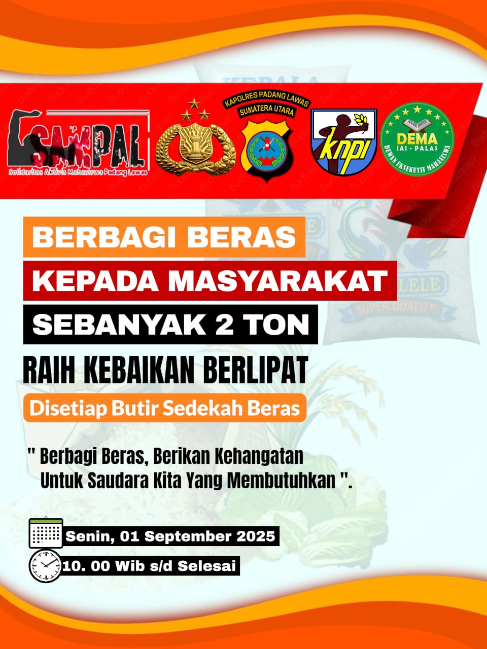 Institut Agama Islam Padang Lawas (IAI-PL)____Dewan eksekusi Mahasiswa (DEMA) Institut Agama Islam Padang Lawas (IAI-PL) jalin kerjasama dengan Polres Padang Lawas serta ormas kepemudaan KNPI Padang Lawas dan SAMPAL melakukan pembagian beras sebanyak 2 Ton kepada masyarakat Padang Lawas yang melintas di depan lapangan merdeka Sibuhuan, keberlangsungan pembagian beras tersebut peminatnya tampak antusias mulai dari tukang becak, ibu-ibu dan lainnya. Senin, (01/09/2025)