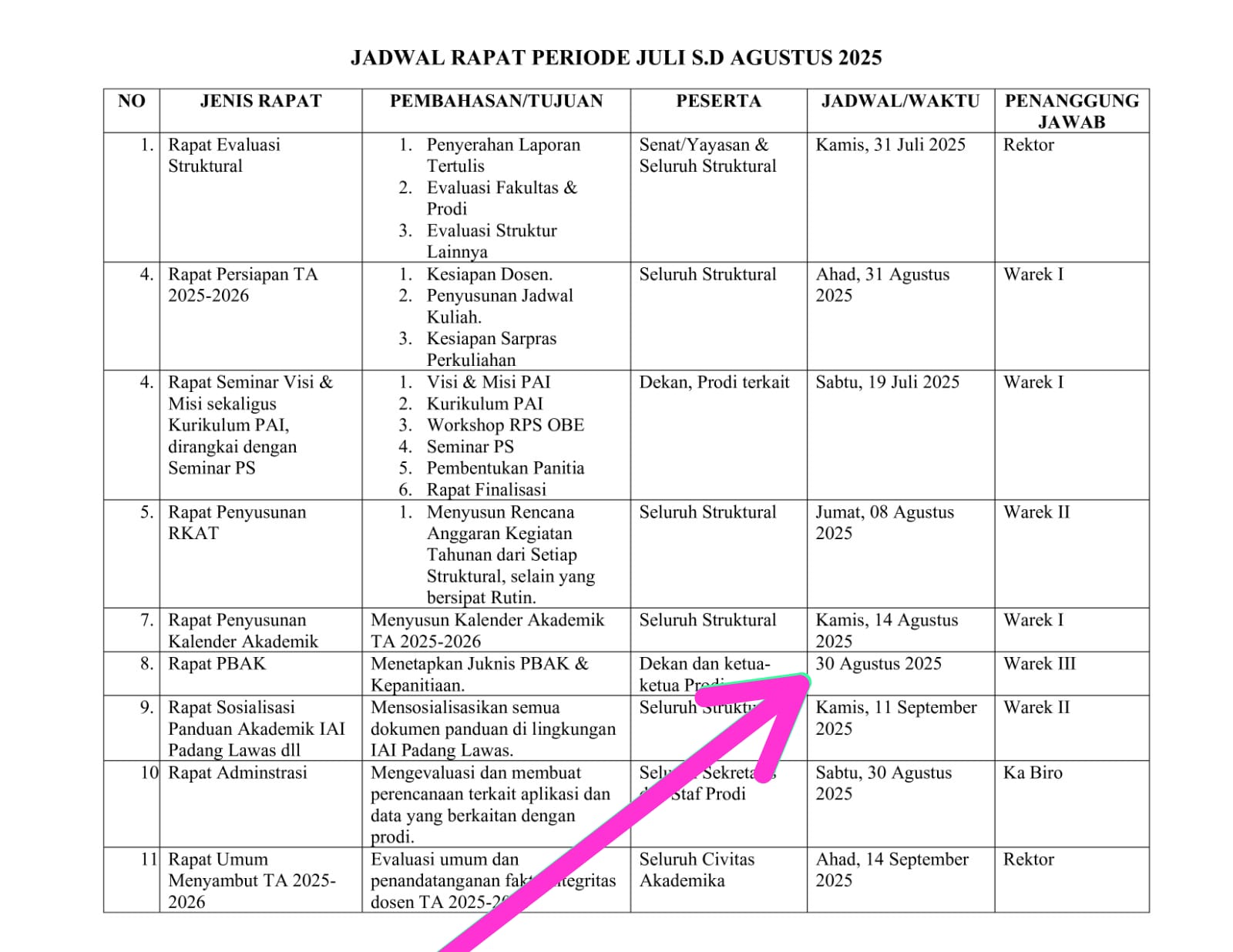 sejumlah pejabat struktural Institut Agama Islam Padang Lawas melaksanakan sejumlah rapat persiapan untuk menyambut Tahun Akademik 2025-2026. Bulan Juli hingga awal September 2025 adalah bulan rapat bagi semua sivitas akademika IAI Padang Lawas, ungkap Rektor. Mulai dari evaluasi kinerja struktural dan dosen, kelengkapan dokumen induk penyelenggaraa program studi baru yaitu PAI yang menyangkut dengan Visi Misi Tujuan dan Strategi, kurikulum dan lainnya. ada juga rapat rapat optimalisasi rekrutmen camaba yang sudah berjalan sebulan sebelumnya, hingga persiapan PBAK mahasiswa baru. Rektor juga menginstruksikan supaya semua dosen melengkapi akun pribadi IAI Padang Lawas-nya terkait dengan Google, Sister dan Sinta yang terperifikai ke pangkalan data dan homebase IAI Padang Lawas.